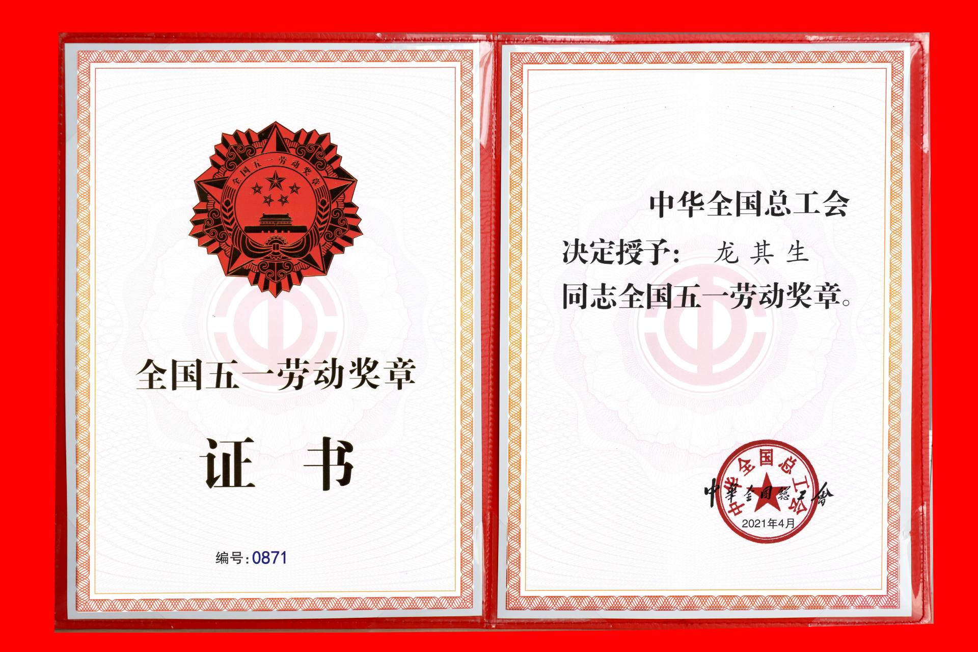 龍其生董事長榮獲2021年全國五一勞動獎證書
